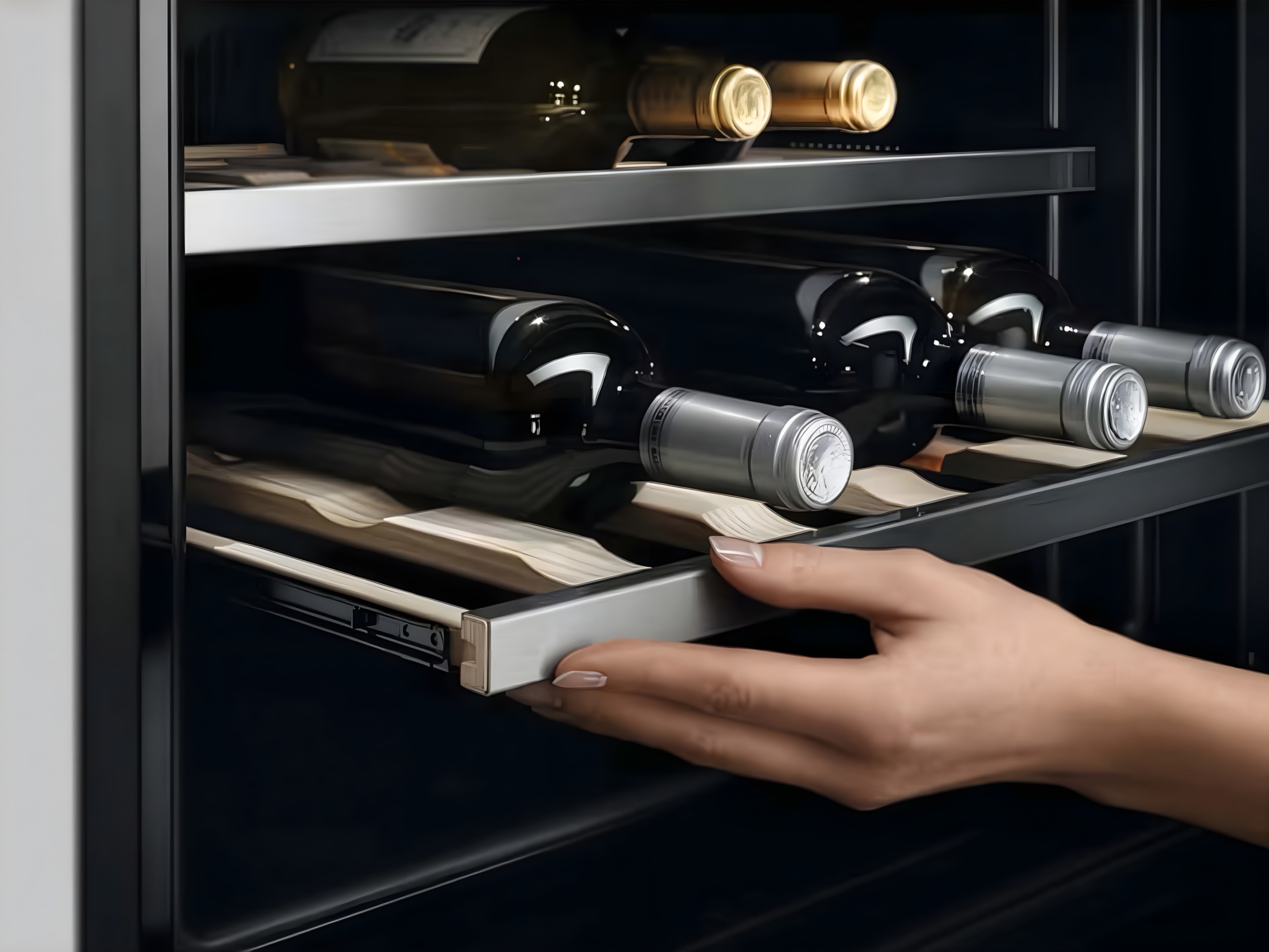 Le design suspendu allège visuellement les volumes et renforce la sensation d’espace. Les lignes sont nettes, continues, sans superflu. Chaque élément s’intègre avec précision pour offrir une lecture fluide et contemporaine de la cuisine.