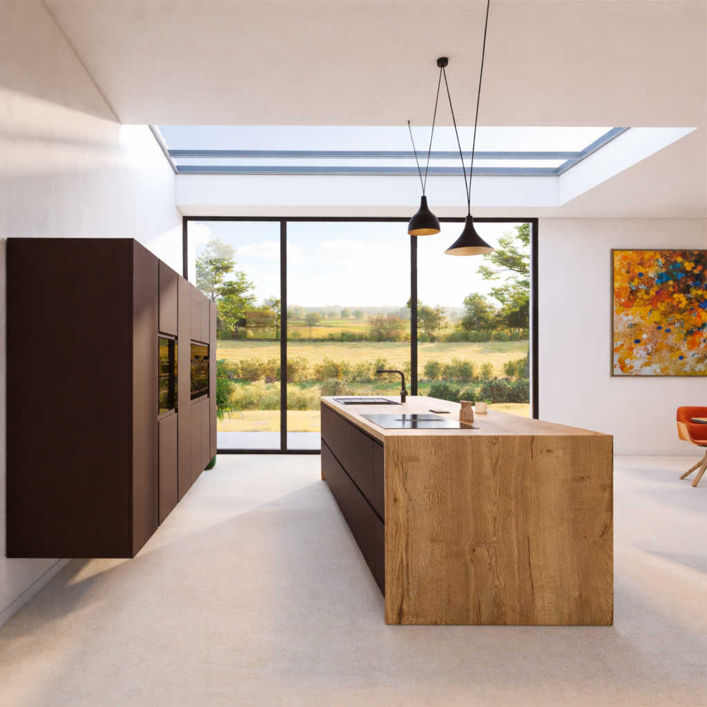 Cette cuisine joue sur un équilibre subtil entre profondeur et chaleur. Les façades aux teintes brun intense apportent du caractère et une élégance naturelle, tandis que le bois clair de l’îlot vient illuminer l’ensemble et créer un contraste parfaitement dosé.
